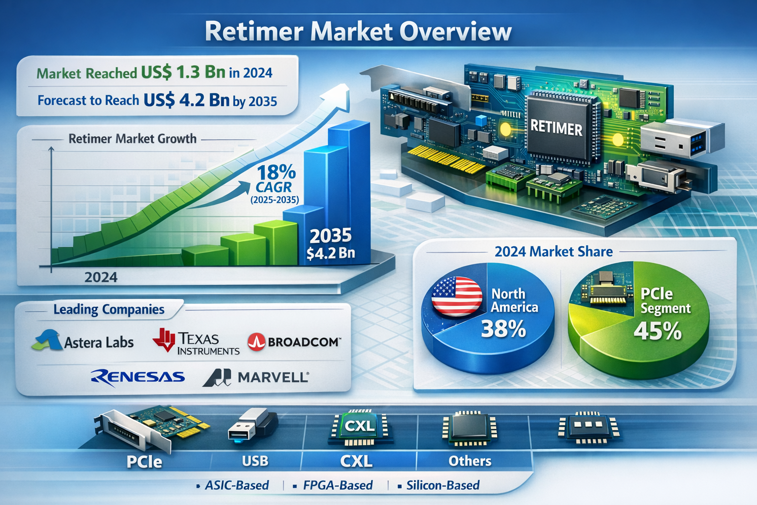 WILMINGTON, DE, UNITED STATES, February 12, 2026 /EINPresswire.com/ -- The global retimer market was valued at USD 1.3 Bn in 2024 and is projected to reach USD 4.2 Bn by 2035. The industry is expected to register a robust CAGR of 18% during the forecast period from 2025 to 2035, driven by increasing demand for high-speed data transmission, growing adoption of data centers, and advancements in high-performance computing and AI infrastructure.— Transparency Market Research Inc.